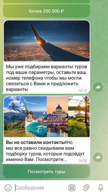 Пользователь переходит в Telegram бота нажимает СТАРТ и отвечает на вопросы квиза (фактически в этот момент мы уже получаем его контакт и можем писать ему в личные сообщения)