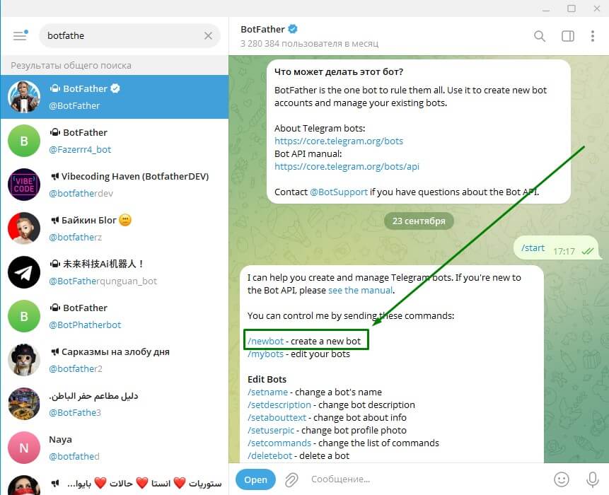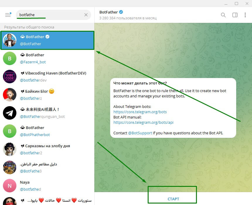 1. Набираем в поиске botfather, находим официальный аккаунт с галочкой, переходим в него и нажимаем СТАРТ