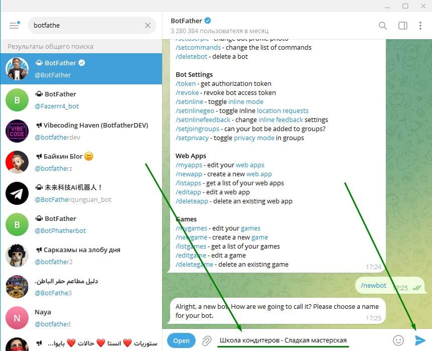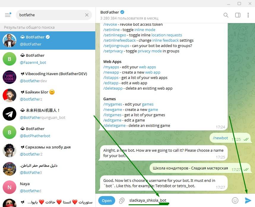 4. Введите имя пользователя (обязательно должно оканчиваться на bot) и нажмите отправить