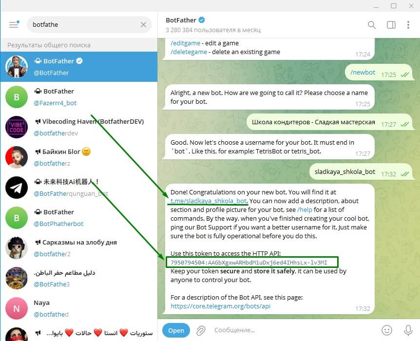 5. Готово. Теперь у нас есть ссылка, по которой доступен бот и API токен для подключения к нашему сервису. API токен можно скопировать просто нажав на него.