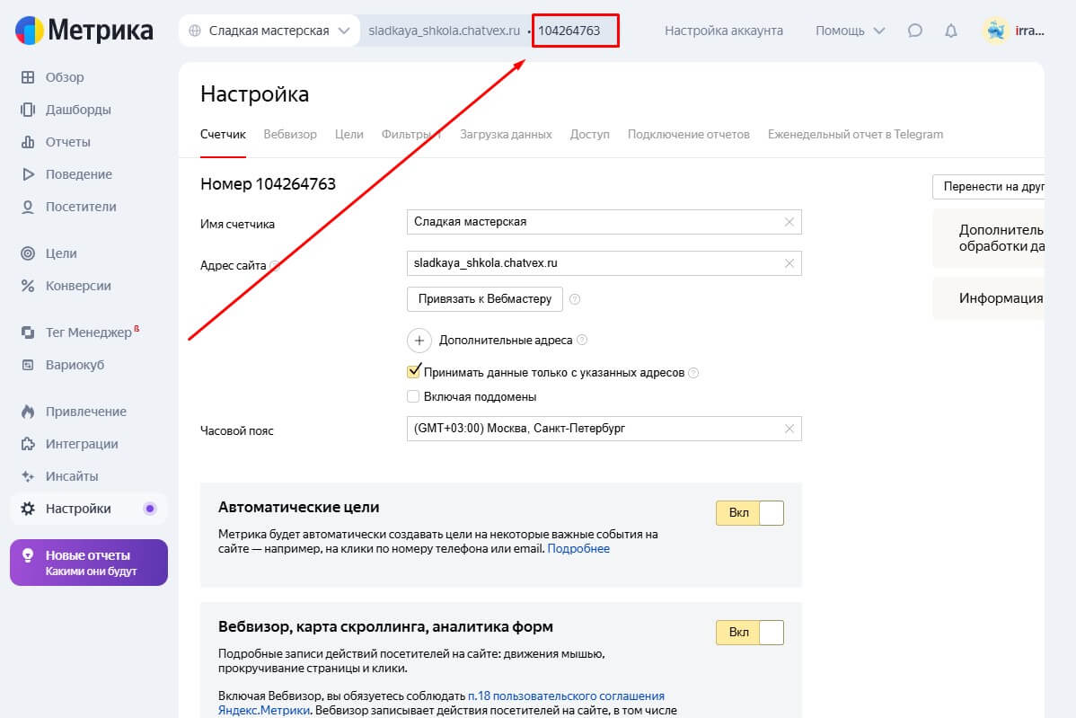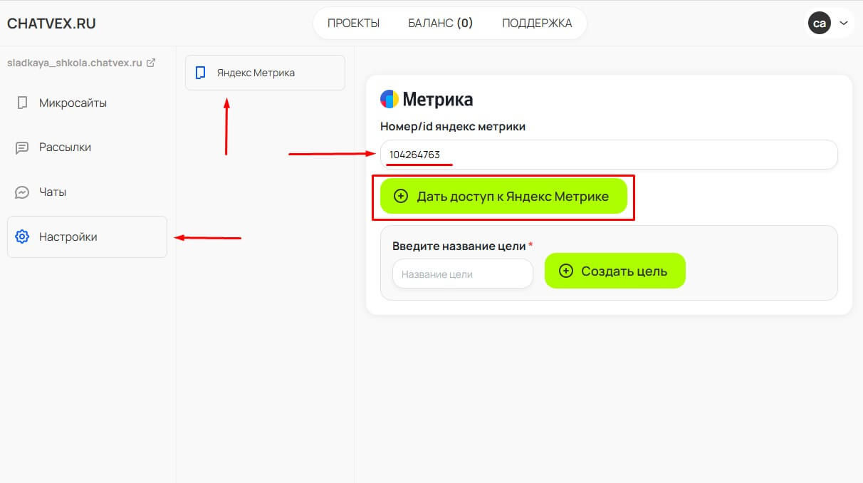 6. Возвращаемся в Сhatvex, в раздел Настройки и вставляем номер в поле Яндекс Метрики, нажимаем "Дать доступ"