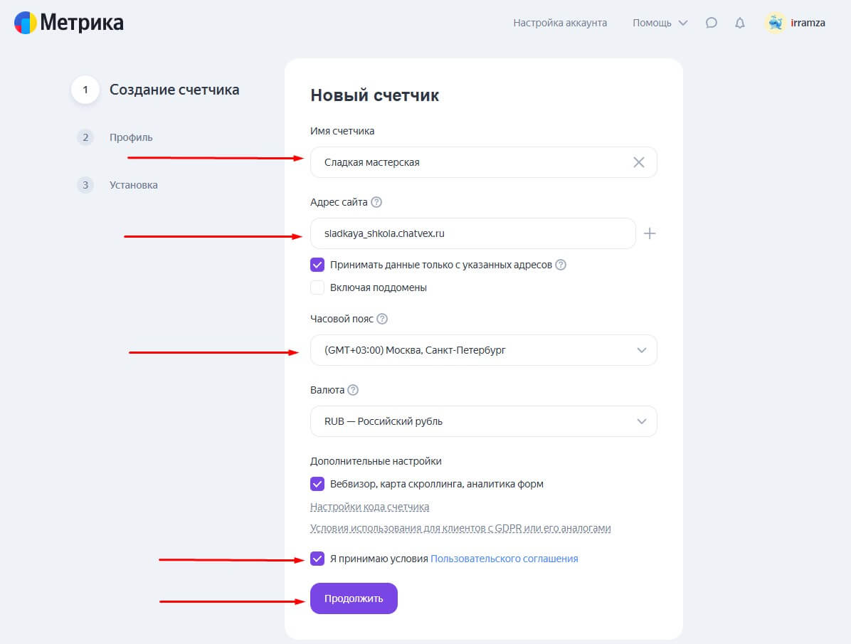 2. Придумываем имя счётчика, указываем адрес посадочной страницы, часовой пояс указываем, ставим галочку - принимаем условия и нажимаем "Продолжит